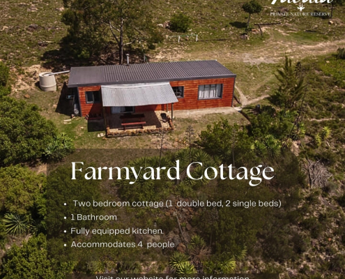 The rustic two-bedroom Farmyard Cottage has an open plan kitchen/lounge area opening onto a veranda overlooking Pabala Private Nature Reserve and Cockscomb Mountain Range. The sunny main bedroom has a double bed with spacious cupboards and a beautiful view. A spacious second bedroom has two single beds, ideal for siblings sharing a room. The bathroom has a traditional bathtub, shower and complimentary toiletries.