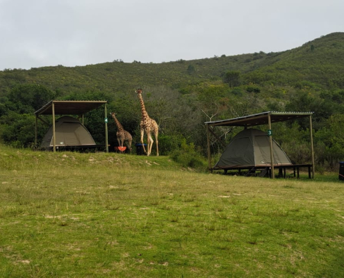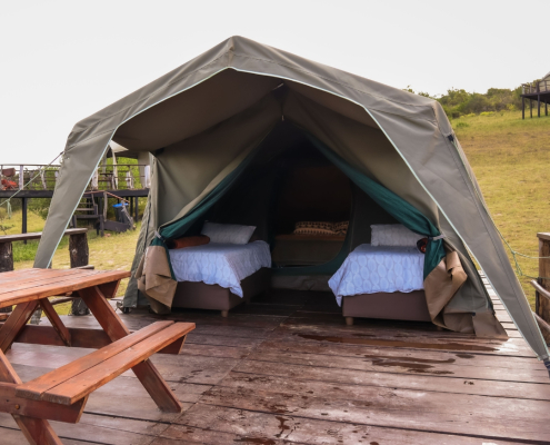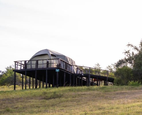 The luxury permanent tents are nestled in the bush and we offer guests the opportunity to experience the African bush under canvas.  The camp is modelled on the heyday of exploration, a golden era when adventure lay around every corner. In order to keep with the authenticity of camping, there is no electricity in our tents. This type of camping can be fun, challenging and adventurous.  Our tents are assembled on wooden decks and fitted with two permanent single beds. Fresh Linen and towels are supplied.  The shared ablution blocks have flushing toilets, warm water and showers.