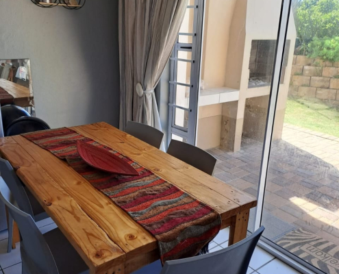 The living room is open plan to the kitchen and has comfy couches with a SMART TV that offers access to YouTube and Netflix by entering your password and login. The kitchen is equipped with a stove, oven, microwave, fridge, fridge-freezer, cutlery and crockery as well as tea- and coffee-making facilities. In addition, there’s a washing machine, Breakfast Island as well as a 6-seater dining table with chairs. This area expands onto the patio that overlooks the green garden and offers braai facilities.