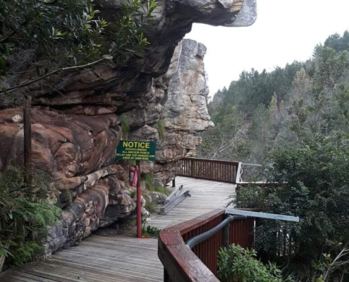 The riverbanks are full of indigenous trees including yellowwoods. The Sundew plant (Drosera) a variety of carnivorous plant can be seen. Birds are abundant and the elusive Knysna Loerie is seen quite often. Dassies (Rock Rabbits) are present. The scenery changes as you zip along is amazing and dominated by Witels Peak just 5 k to the north-east. Witels Peak is dominant in the Tsitsikamma mountain range that is to the north of us.