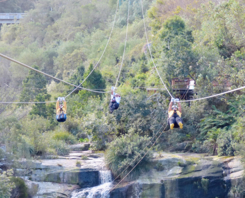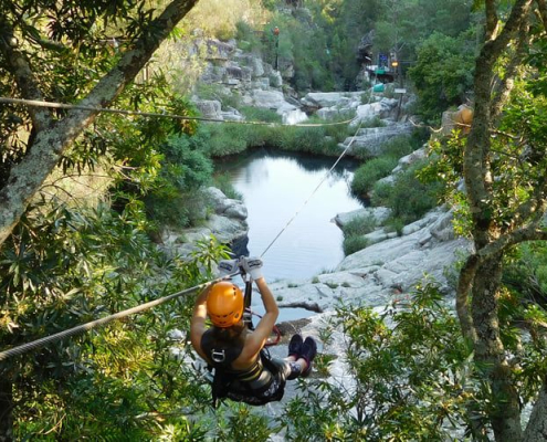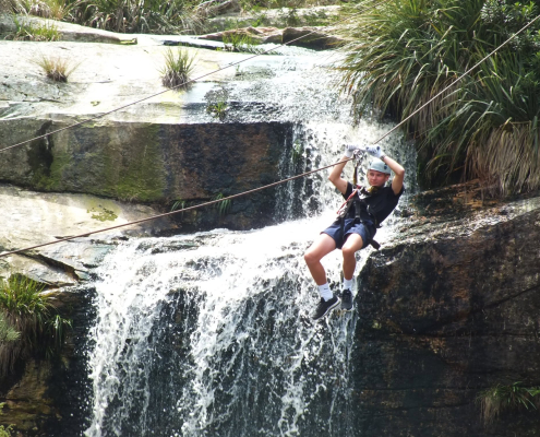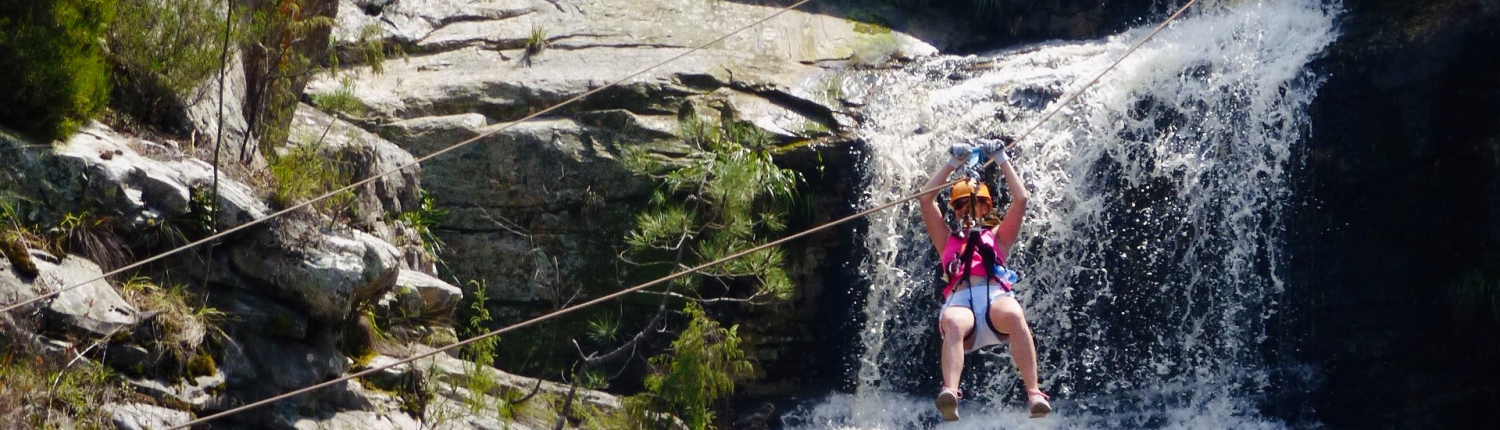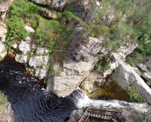 THE ADVENTURE: The zipline tour consisting of 8 slides is done in a harness fitted with a braking system and takes one back and forth across the Kruis River. The longest slide is 211 metres and average length is 100 metres for R650 per person. The tour takes a group of 10 about 90 minutes and 2 people about 40 minutes. The group is always accompanied by 2 guides. The slides take one over 3 waterfalls and down a gorge.