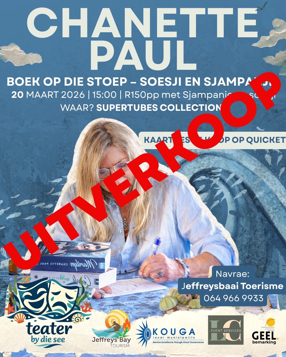 Join us for an intimate Afrikaans book reading session with Chanette, where she’ll share insights into her captivating storytelling and connect with fans over Sushi and Champagne in our beautiful coastal setting.
